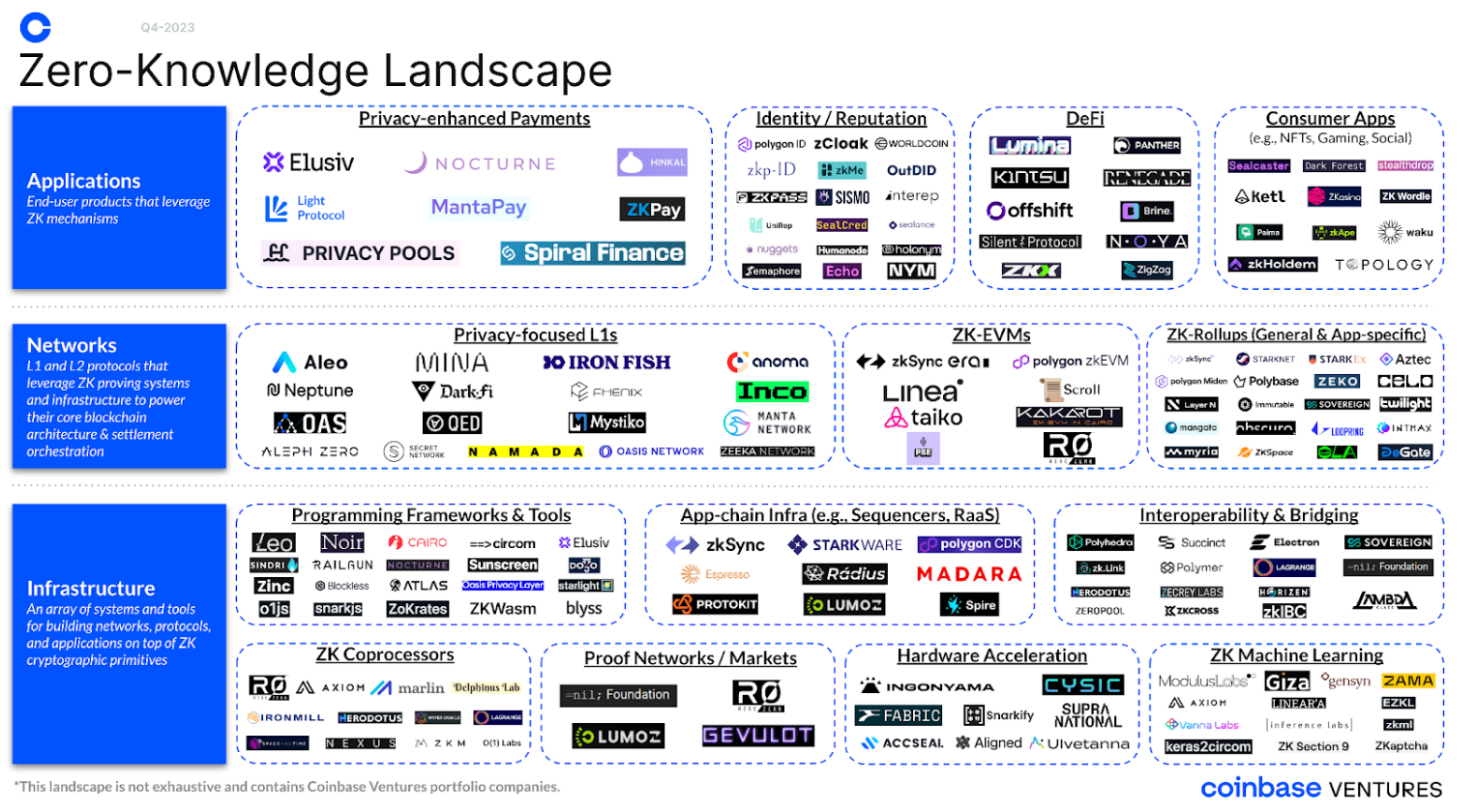 注:Coinbase Ventures 投资的项目出现在上述零知识证明赛道中:Aleo、Anoma、Aztec、Consensys、Espresso、Elusiv、Mina、Polygon、Polymer Labs、Starkware、Sunscreen、zCloak、zkLink、zkSync