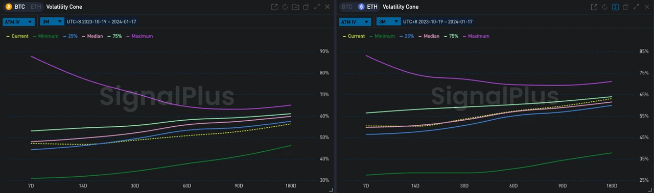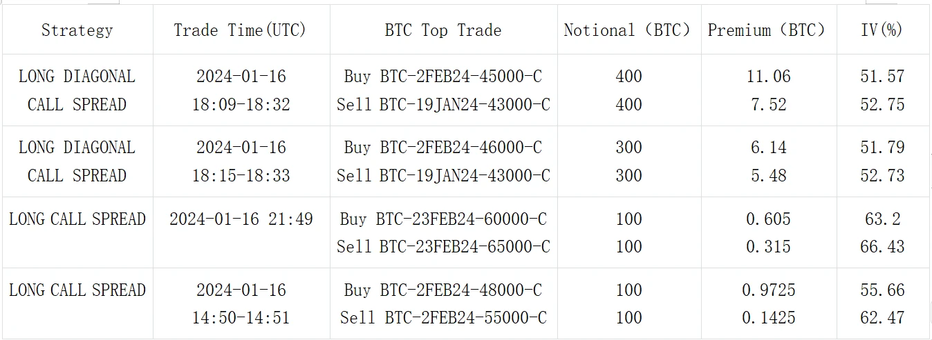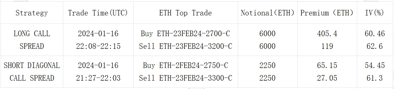从交易上看, 23 FEB 24 的 Call Spread 再度得到市场的青睐,代表的有 BTC 60000 vs 65000 和 ETH 2700 vs 3200 ;另外我们观察到,在当前持续了 4 天多的整盘行情下,近期的三角看涨策略也得到了关注,对 BTC 来说,交易员通过卖出 19 JAN Call 降低了买入 2 FEB Call 的成本,将押注波动发生的时间点推后至下周,ETH 同样是买 2 FEB Call,但是选择了卖出更远的 23 FEB 作为对冲。