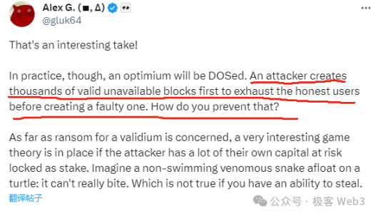 但相对的, 数据可用性挑战也有需要解决的经济问题。 ZkSync 创始人在和 Arbitrum 技术负责人 battle 时指出, 数据可用性挑战在理论上容易遭到 Dos 攻击。 比如,排序器快速在链上发布数千个 DA commitment,然后扣住对应的完整数据不发布。它可以通过这种方式耗尽所有挑战者的资金,然后发布一个无效区块,盗取用户资产。