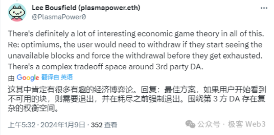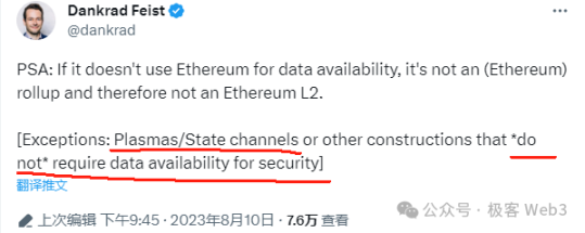 换言之,Plasma 的安全提款对 DA 系统没有依赖, 抗审查提款也不是非要对 DA 系统有依赖(但要保证历史数据可获取);况且, 这番话是以太坊基金会的 Dankrad(Danksharding 提出者)亲口说的, 同时也是放之四海皆公理的。