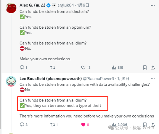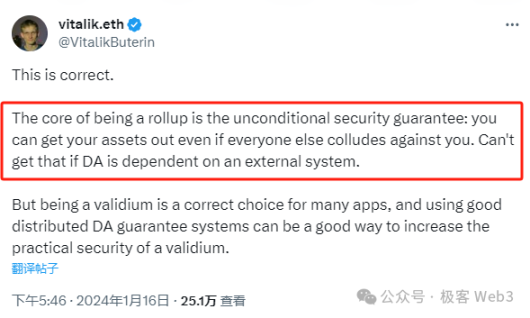 2024 年 1 月 16 日,在一条由以太坊 Layer 2 项目 Taiko 创始人 DanielWang 发起,与 AA 钱包 Soul Wallet 创始人曾嘉俊互动的推文下, Vitalik 说:「Rollup 的关键在于无条件的安全保障:即使你被所有人针对,你依然能将资产取走。如果 DA 依赖于外部系统(以太坊之外),就无法做到这一点。」