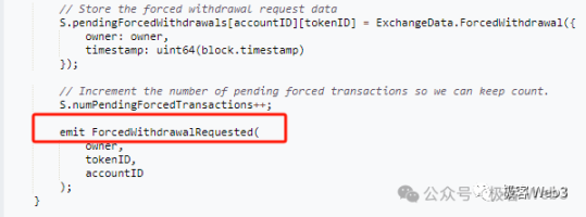 不过,在激活逃生舱模式前,被排序器拒绝的用户,要先调用 Layer 1 上 Rollup 合约中的强制提款函数,发起强制提款请求,并抛出一个事件让 Layer 2 节点知晓:有人发起了强制提款请求。
