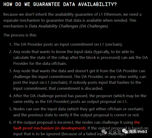 其次,抛开 Celestia 及 Blobstream 不说,数据扣留 /DA 故障问题,就算不用 ETH 作为 DA 层,也可以解决。单说 Arbitrum 团队与 Redstone 团队正在实现的「数据可用性挑战」,允许排序器只在链上发布一个 DA Commitment(其实就是 datahash),声明已经在链下发布数据。如果有人无法在链下获取到新产生的数据,则可以针对链上的 DA Commitment 发起挑战,要求排序器将数据披露到链上。