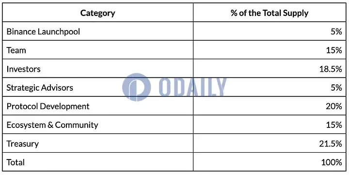 代币经济学:总量 100 亿枚,投资者分配总量的 18.5% ,币安 Launchpool 分配 5% ,团队分配 15% ,战略顾问分配 5% ,协议发展分配 20% ,财库分配 21.5% ,生态系统和社区分配 15% 。