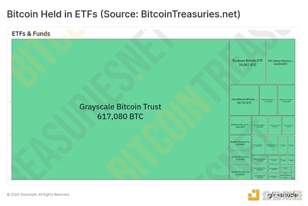 GBTC 相对于其他 ETF 产品的绝对规模可以从 bitcointreasuries.net 的下图看出。 尽管 GBTC 出现流出,但他们持有的 617,080 BTC 的巨额份额令竞争对手相形见绌,而且相关的流动性状况对于任何对流动性和深度敏感的交易者和投资者来说仍然具有吸引力。