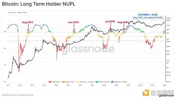 这些长期持有者持有的未实现损益程度可以通过 LTH-NUPL 来衡量。该指标本周达到了 0.55,这是一个有意义的正数,使长期投资者的平均未实现利润达到 55%。