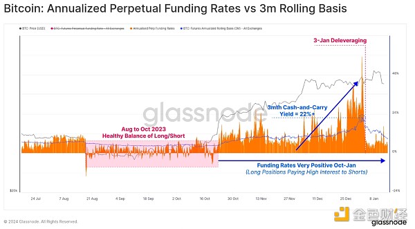 我们可以看到,在 1 月 3 日发生了一次重大的去杠杆事件,几乎有 15 亿美元的未平仓合约在一天内被清算。相反,在 1 月 9 日至 11 日之间,随着 ETF 猜测达到顶峰,价格接近 49,000 美元,未平仓合约大幅增加。