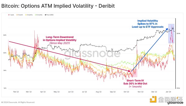 这种下降趋势似乎在短期内发生了逆转,IV 自 10 月份约 30% 的低点以来增加了两倍多,本周达到 97% 以上。随着现货 ETF 产品为机构和零售资本打开新的大门,比特币的波动性很可能也将开始演变。