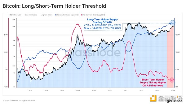 长期持有者的供应量也略微低于其 ATH,自 11 月以来减少了约 75,000 BTC,因为旧比特币被用来获利了结。