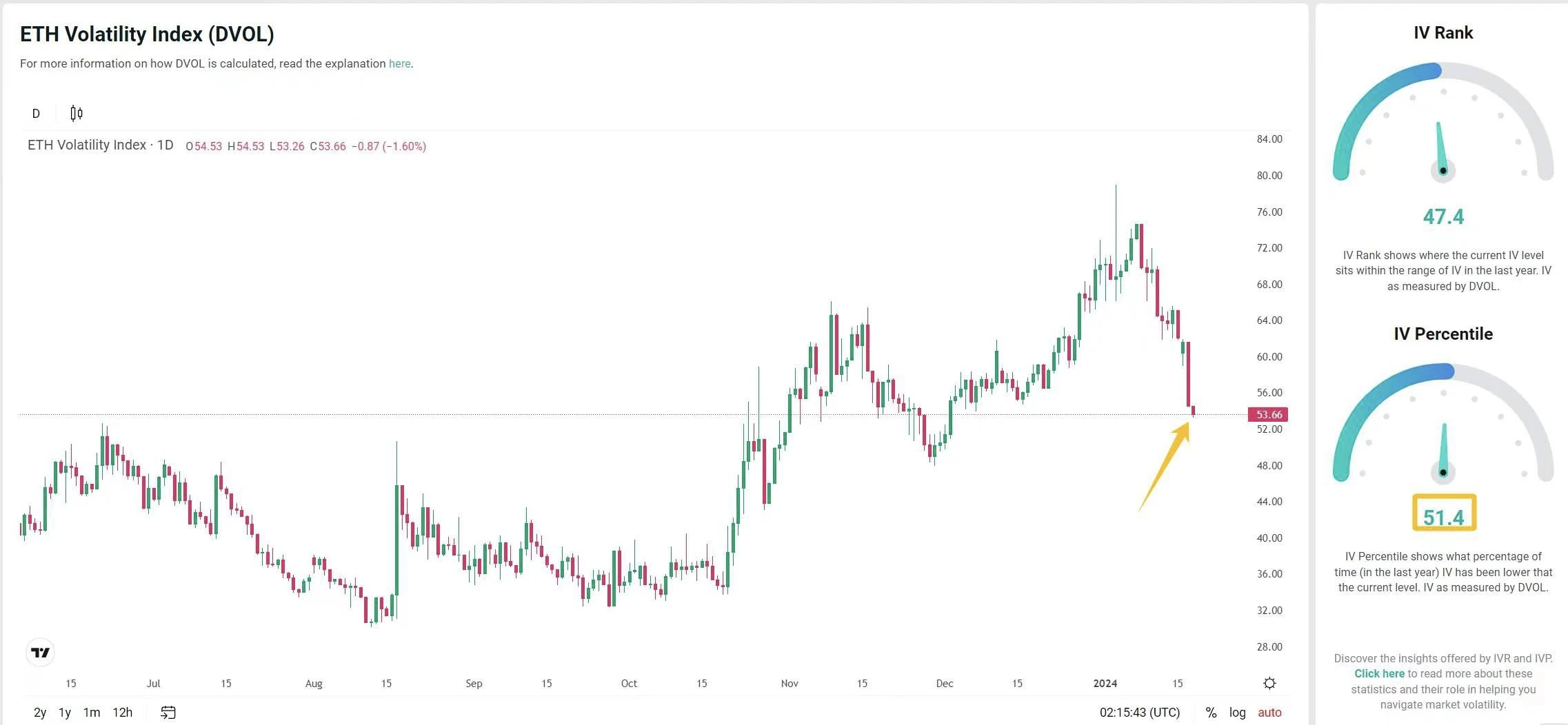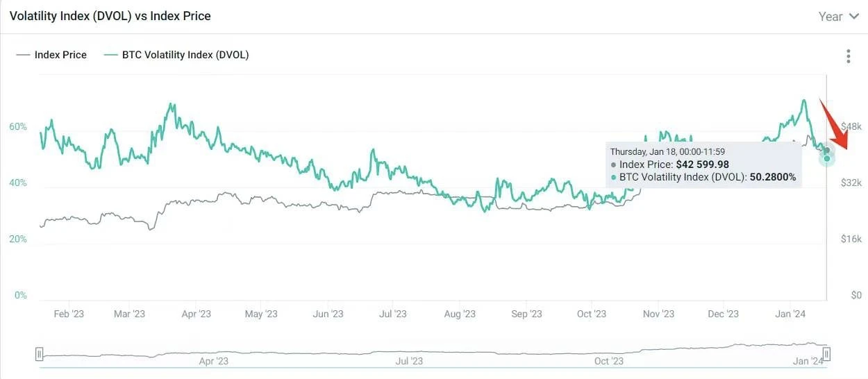 BTC 的波动率 DVOL 一下子从 ETF 通过前的高点 70 跌到了 50 ,降幅近 30% ,过去一年 55% 的时间高于这个数值。市场估计会平盘一段时间,想要建仓的可以现货慢慢入,或者卖看跌期权来低价囤货。