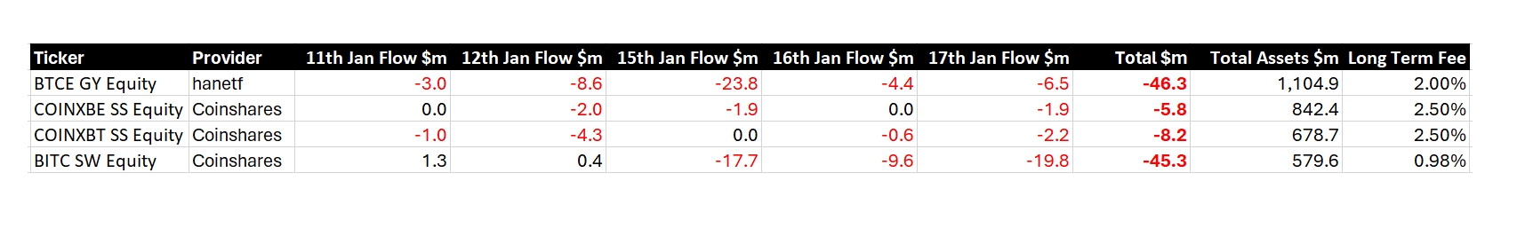 在四天里(1月11日、12日、15日和16日),最大的四个欧洲比特币ETP资金流出总额达7520万美元。