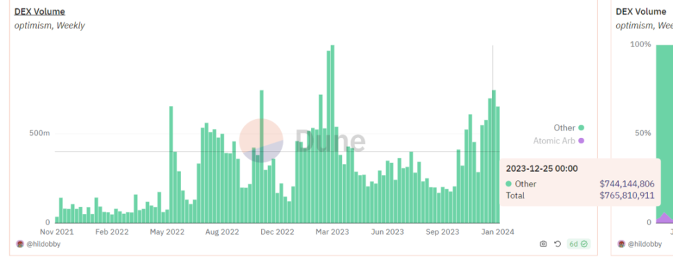 在 Optimism 上,套利交易的比例在 2% 到 4% 之间,与去年相比显示出下降趋势。套利交易的交易量相对较低。