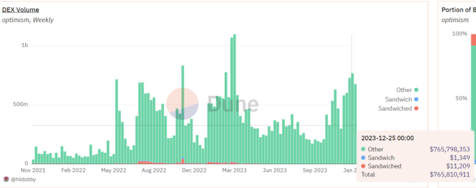 在 Optimism 上,情况有所不同。区块交易中的三明治攻击比例曾一度高达 62.7% ,但随着时间的推移已逐渐降低,原因是 bedrock 升级引入了类似 EIP-1559 的 gas 机制。最近,三明治攻击的比例已降至足够低的水平。在交易量方面,三明治攻击的规模已减少到几千美元。