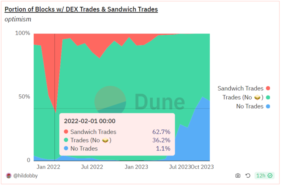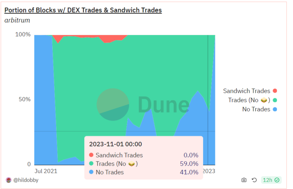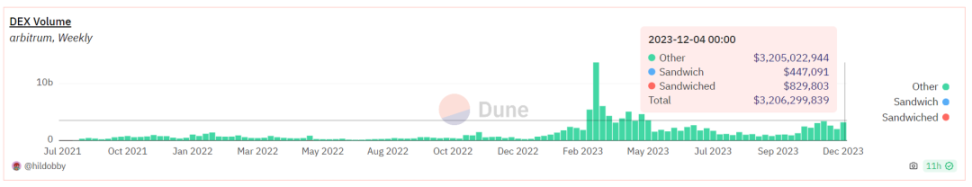 自 2023 年以来,Arbitrum 区块交易中三明治攻击的比例已降至足够低的水平。在交易量方面,总交易量为数十亿美元,而涉及三明治攻击的交易量仅为数十万美元,也是非常小的。这可能跟 Arbitrum FIFO 的交易排序规则有关。
