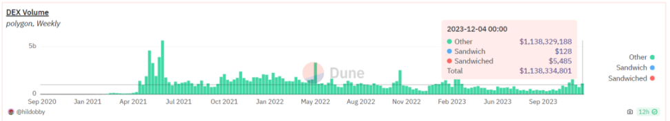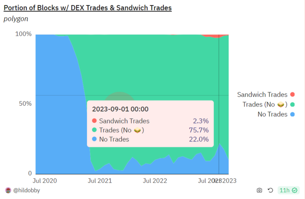 Polygon 上的三明治攻击相对较少,大多数时间低于 1% 。在今年 9 月份,它达到了大约 2.3% 的峰值。基于交易量来看,受三明治攻击影响的交易量非常低。