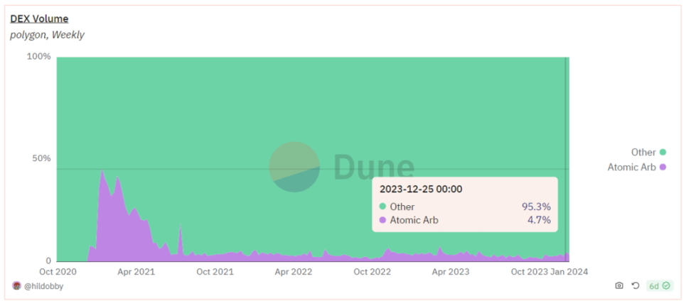 在 Polygon 网络上的套利交易占比更高,并且交易量显著大于三明治攻击。