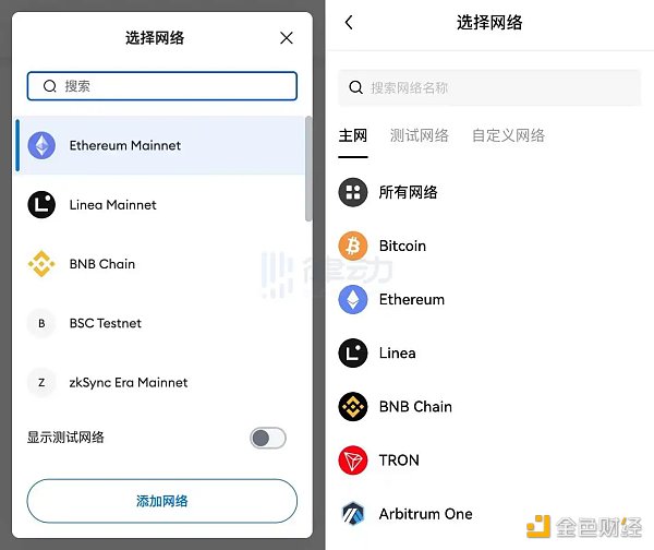 除了手机端,OKX Web3 钱包的插件端从 UI 界面可以看出,与 MetaMask 钱包相比 OKX Web3 钱包提供了更多细节方面的改善。比如在钱包「选择网络」版块,左侧 MetaMask 需要手动添加,右侧 OKX Web3 钱包显示支持的所有网络,并提供「所有网络」选项可供用户查看账户全部资产。而在币种展示界面,OKX Web3 钱包除了显示数量和余额外,还会显示币种当前价格和涨跌幅。