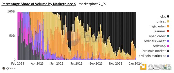 除了比特币生态崛起,还有拿了逆袭剧本的 Solana,SOL 是 2023 下半年币价拉升反弹的领头羊之一,截至 2023 年底,SOL 市值为 438 亿美元,环比增长 423%,同比增长 1106%。meme 币 BONK 和 JTO 空投打头阵,将 Solana 生态热度带出圈,随后迎来的 meme 季甚至让 Solana DEX 交易量一度超越以太坊,让 Solana 生态的基础设施项目获得了大量的收益,其中包括 DEX Raydium 以及钱包 Phantom。
