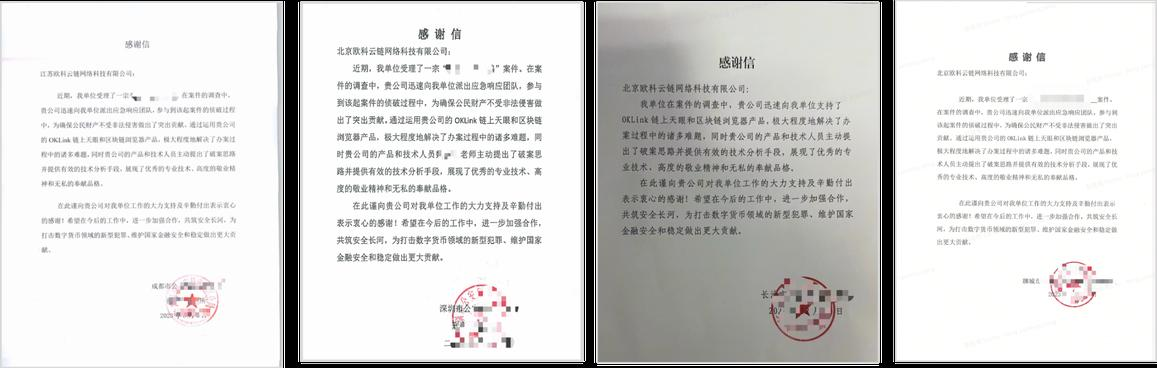 目前,欧科云链研发的“链上天眼”已支持包括BTC、ETH在内的20条主流公链、全币种的链上分析研判,拥有超过35亿的地址标签和近7000万黑灰地址库,可一站式满足监管执法机构及链上数据分析人员的数据分析需要。目前依托链上天眼系统,在全国范围已为120余家地市级单位支撑破获案件800余起,打掉地下钱庄5个,涉案资金约300亿人民币,成功侦破各类案件数百起,并收到了各地执法机构和合规团队的好评和感谢。