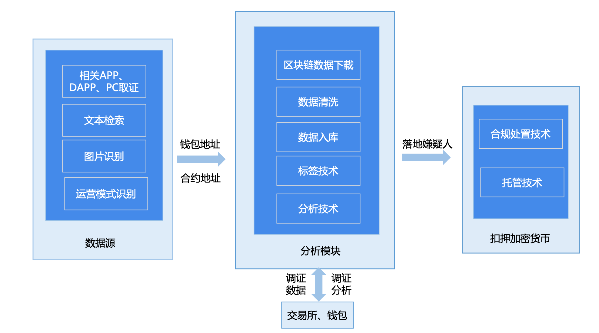 针对反洗钱风险相关难点,欧科云链结合反洗钱三大核心制度(客户身份识别制度、大额和可疑交易报告制度、客户身份资料及交易记录保存制度)的需求以及虚拟资产反洗钱与传统金融反洗钱的差异,根据FATF于2019年提出的旅行规则(Travel Rule),结合包括香港证监会在内的多国监管机构提出的虚拟资产反洗钱相关指引,以区块链、大数据和机器学习等技术为支撑,借助OKLink所积累的海量链上数据及地址标签库,构建了面向虚拟资产反洗钱的Onchain AML合规技术方案,能够完善的解决以上风险问题。