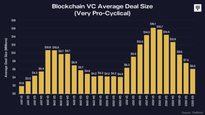 根据我们在 Pantera 的观察,我们认为融资和交易活动的低谷可能出现在去年夏天。最近,我们看到由上一次牛市期间进入的企业家推动的交易活动大幅回升,这些企业家的业务已经成熟,有可能找到适合市场的产品,或者一直在执行正确的战略,并且现在回来并以合理的估值筹集资金。