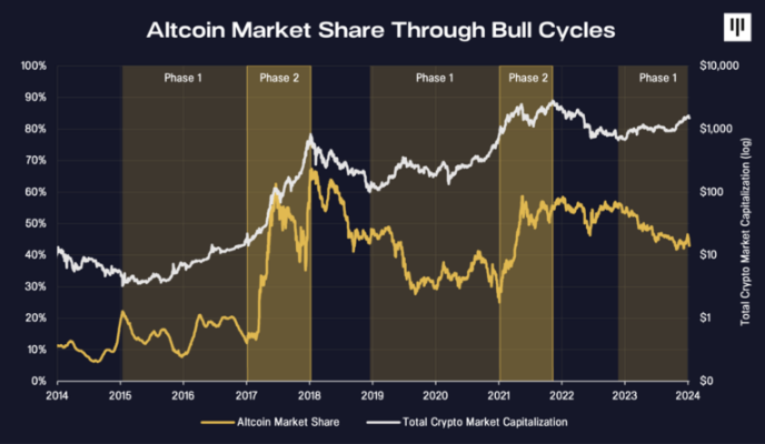 我们观察到牛市周期有两个明显的阶段。第一阶段是反弹的早期阶段,此时比特币的表现往往优于市场的其他部分。第二阶段是山寨币表现往往优于大盘的后期阶段。