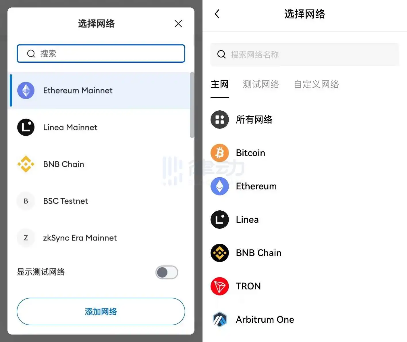 除了手机端,OKX Web3 钱包的插件端从 UI 界面可以看出,与 MetaMask 钱包相比提供了更多细节方面的改善。比如在钱包「选择网络」版块,左侧 MetaMask 需要手动添加,右侧 OKX Web3 钱包显示支持的所有网络,并提供「所有网络」选项可供用户查看账户全部资产。而在币种展示界面,OKX Web3 钱包除了显示数量和余额外,还会显示币种当前价格和涨跌幅。