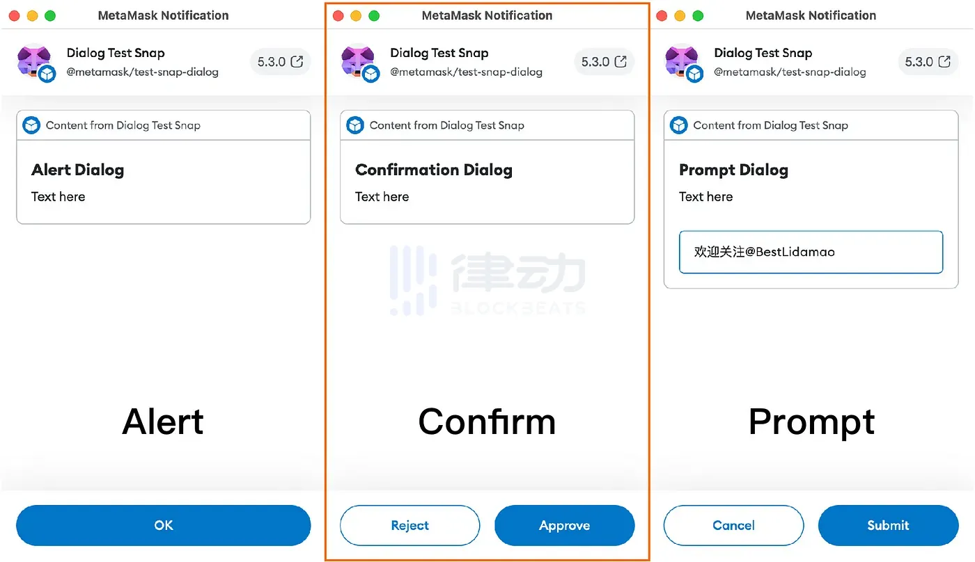 比如 EthSign 开发者团队基于 MetaMask Snaps 创建了一个名为 KeyChain 的通用密码管理器,所有浏览器密码都可以使用钱包密钥进行加密和存储。这本身是一个很有市场的产品概念,却并没有获得破圈效应。又或是 MetaMask Snap 的 Dialog 功能,可以弹出一个单独的窗口,类似于传统的警报/确认/提示对话框,分别用于交易提醒、确认和信息提交,但显然这对用户交易体验的提升帮助并不大。