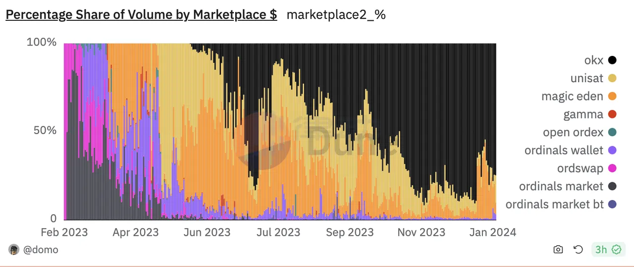 而早期作为买卖 BRC 代币仅有的链上出入口,比特币钱包 UniSat 成了整个币圈都在讨论的名字,是为数不多真正把握住比特币生态爆发的早期项目。2023 年 5 月前后,Dune 数据显示,Unisat 在这段时间每日独立用户数在 4000 人到 8000 人左右,在彼时的市场上是绝对的主流。