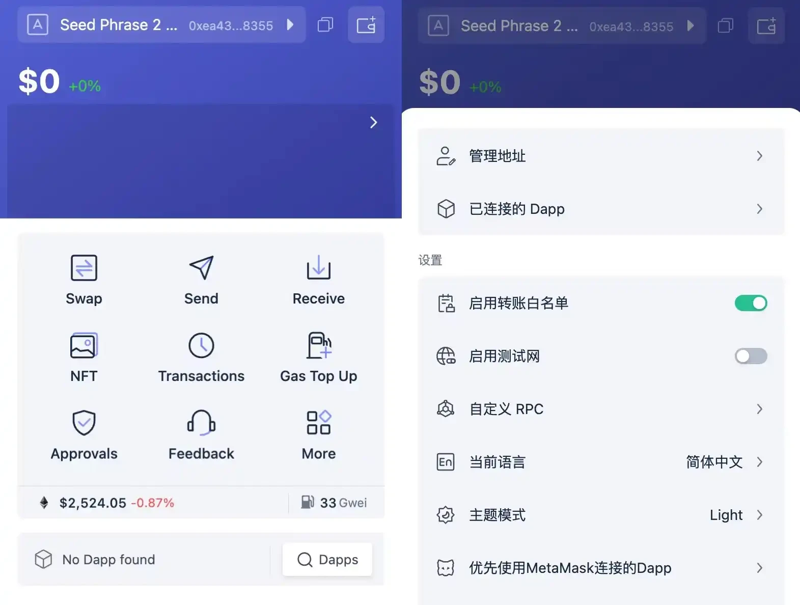 左:MetaMask 插件界面 右:OKX Web3 钱包插件界面