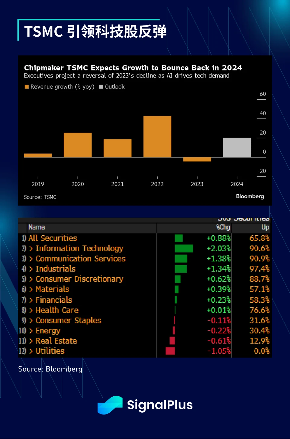 股市在科技股的带动下出现反弹,TSMC 预计 2024 年将回到“健康增长”,带动费城半导体指数走高,该公司预计 2024 财年营收将增长 20% ,并预计在日本、亚利桑那州和德国的全球扩张计划中投入 280 至 320 亿美元。