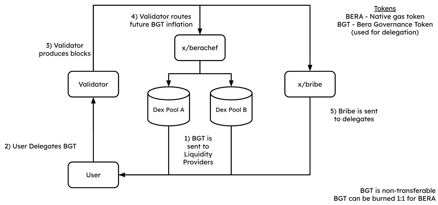 在流动性证明机制中,用户必须将其蓝筹代币例如 BTC、ETH 等向 BEX (Berachain 原生 DEX)组成流动性 LP 来得到协议治理代币 $BGT,而 $BGT 代币将负责链上节点的验证机制并具有投票治理功能(例如可以决定 LP 池代币奖励发放等)。
