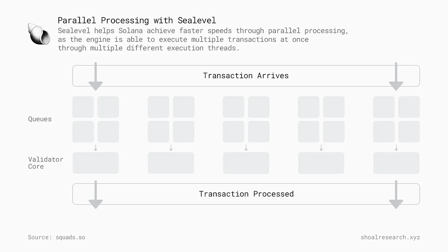 用 Rust、C、C++编写的智能合约代码会被 SVM 编译成 BPF 字节码。Sealevel 引擎是 Solana 上实现并行处理的关键组件;随着 Solana 交易中集成了状态访问列表(交易包含要访问的特定状态的详细信息),这使得不冲突的交易可以同时运行,从而实现更快的整体性能。