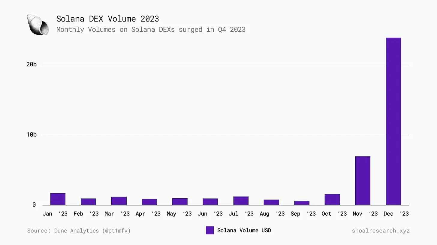 Solana 12 月份的 DEX 月交易量达到 238 亿 美元,创下 2023 年的年度新高。
