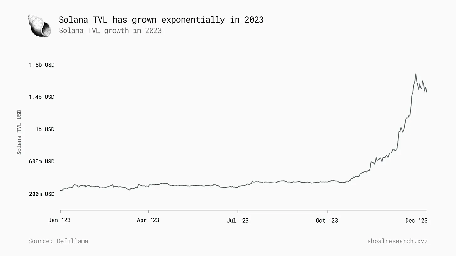 2023 年 1 月 1 日至 2024 年 1 月 1 日,Solana 的 TVL 和链上交易指标均显著增长。这一时期标志着 Solana 发展的重要阶段,尽管在 FTX 崩溃后 TVL 有所下降,但交易价值和交易量仍显著增加。