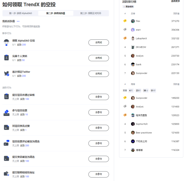 TrendX 1 月 16 日发布的最新空投计划: TrendX 正式代币的 4% (40, 000, 000 枚)将用于早期贡献者空投,其中 2% 将空投给参与治理并取得一定活跃值的用户, 2% 将空投给早期使用交易功能的用户(交易功能预计 2024 年Q1上线)。空投将分 2 轮完成。空投的数量取决于用户在平台的活跃值和贡献度。 领取空投的资格条件:
