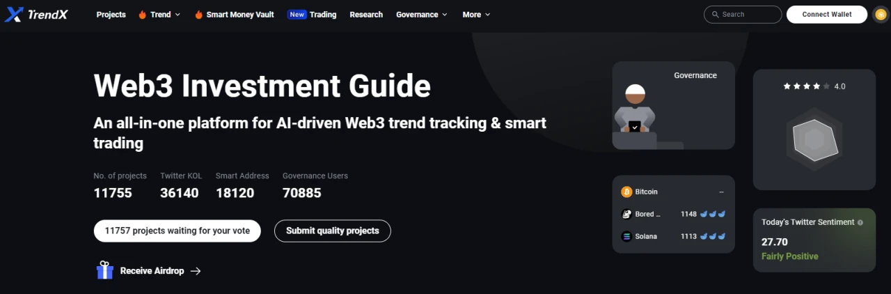 TrendX 是全球领先的人工智能驱动的Web3趋势追踪和智能交易平台,其通过结合 AI 驱动的趋势追踪和智能交易,提供全方位的项目发现、趋势分析、一级投资和二级交易体验。1 月 8 日,TrendX 宣布已成功获得 100 万美元的种子轮融资。TrendX 也将在 2024 年上半年逐步推出 Launchpad 功能,以及币币聚合交易、跨链聚合交易和 AI 交易助手等业内领先的 AI 交易功能。