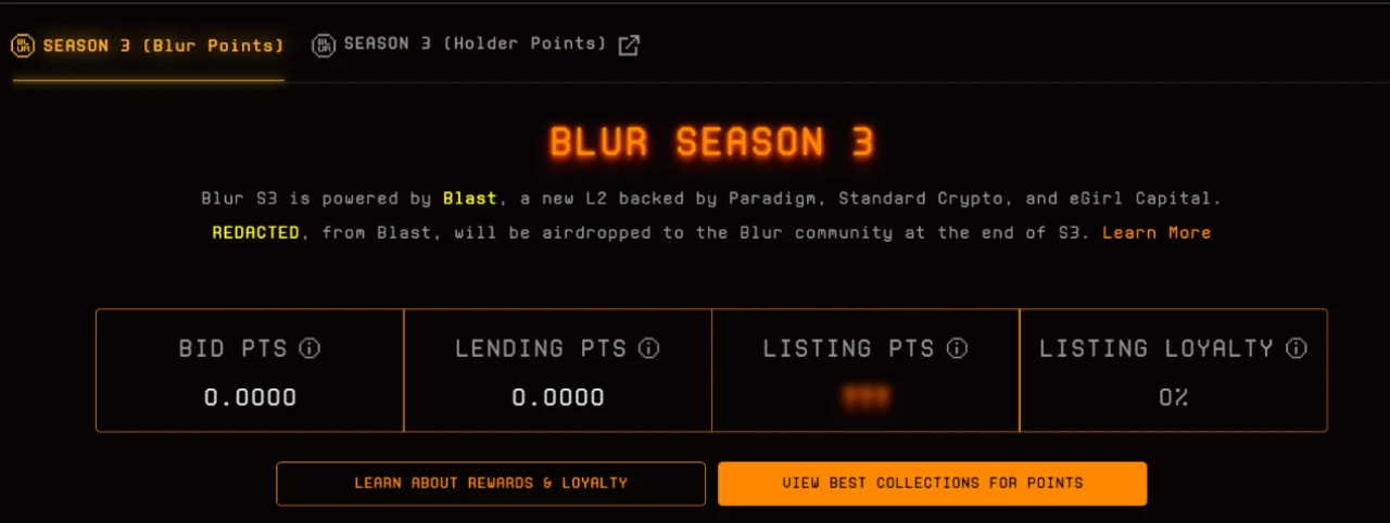 Blur 是一个具有很多创新功能、为专业交易者设计的 NFT 市场和聚合器。作为一个实时 NFT 市场和聚合器的结合,其支持 NFT 批量交易,并且采取零版税费用。Blur 已宣布开启了第三季空投,本季奖励的 50% 将分发给 BLUR 代币的持有者, 50% 将分发给 Blur 社区成员。第三季积分空投活动将于 2024 年 5 月结束。