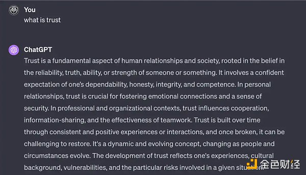 「信任是人际关系和社会的一个基本方面,植根于对某人或某事的可靠性、真理、能力或力量的信念。」