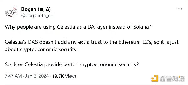 在 Celestia 上运行 Sovereign Rollups 和轻客户端的用户可以惩罚 Celestia 验证者的(潜在)不当行为,而在 EigenDA 中,这种惩罚完全取决于运营商。因此,在 Celestia 中惩罚不当行为更容易,而我在 EigenDA 中没有看到这种改进。