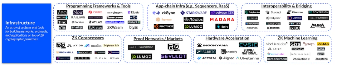 ZK 生态可分为 3 层: 1) 基础设施(即用于在 ZK 原语之上构建协议或应用的工具或硬件)、 2) 网络(即利用 ZK 证明系统的 L1 和 L2 协议),以及 3 ) 应用(即利用 ZK 机制的用户终端产品)。
