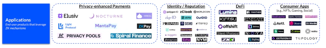 ZK 基础设施和网络层之上是一批新兴的终端用户应用程序,它们利用 ZKP 进行链上支付、身份、隐私但合规的 DeFi 和消费者用例。
