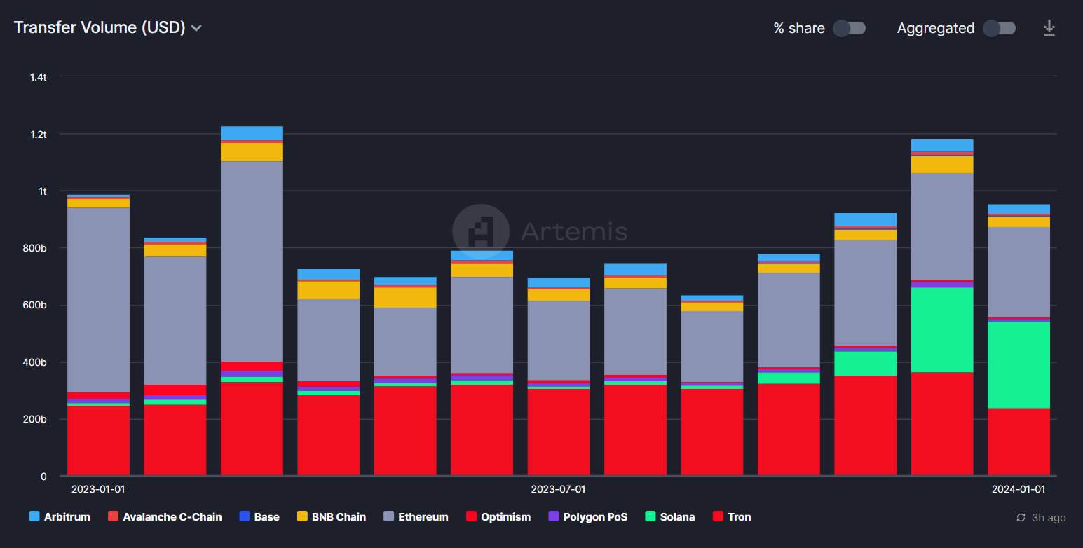 高于2023年12月链上稳定币转账额(2970亿美元),并且相比2023年1月(115.6亿美元)增加2520%。