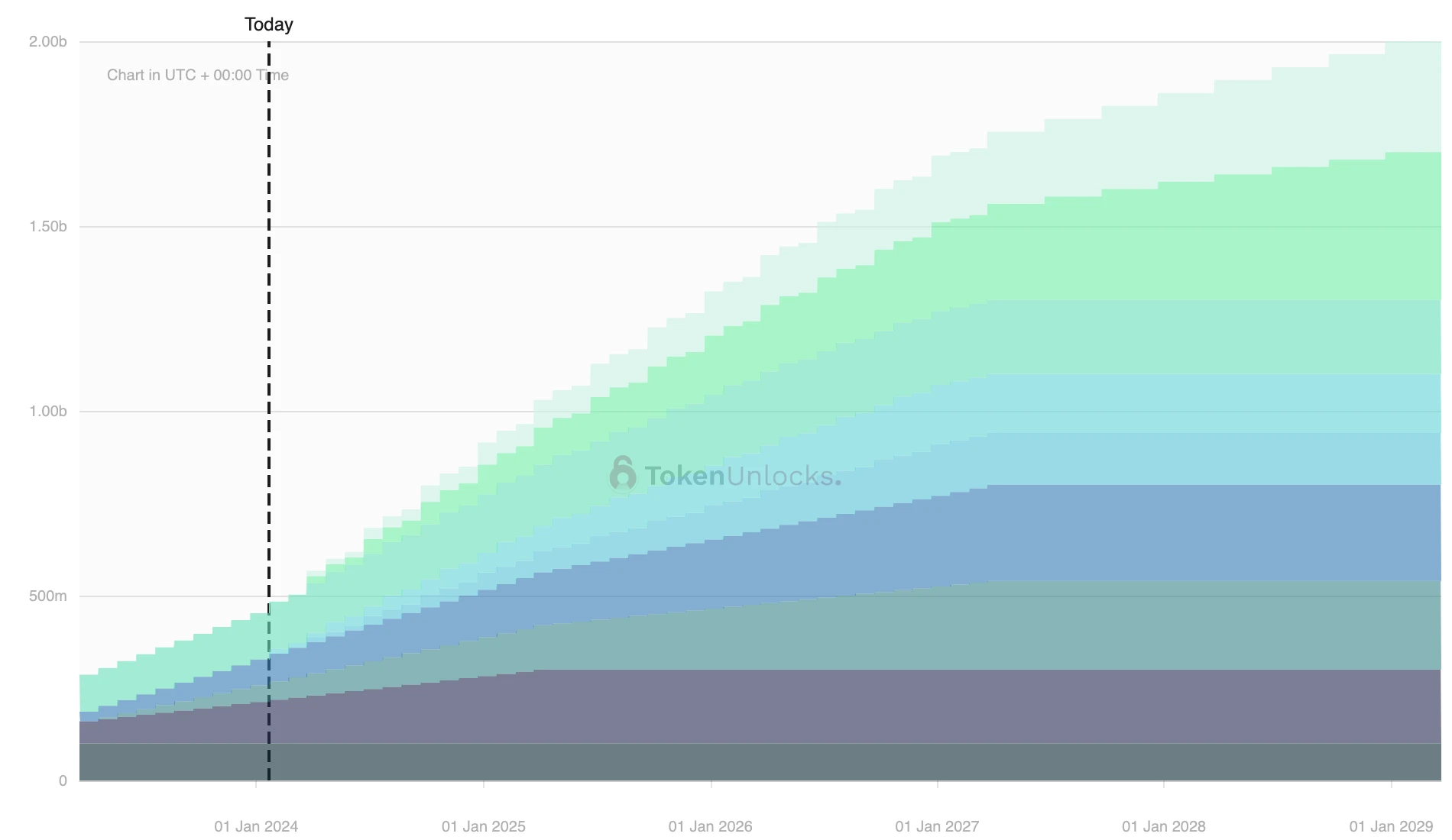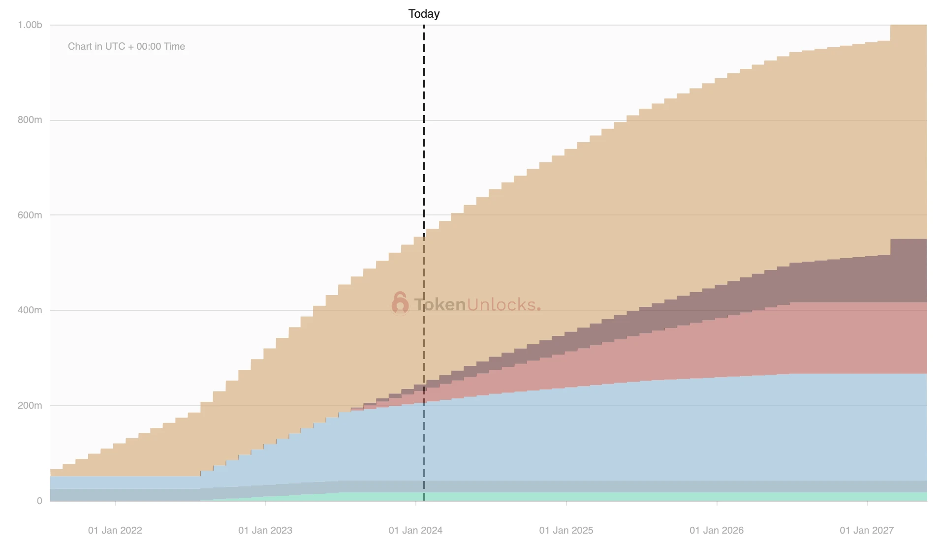 解锁信息表明,本次解锁代币中约 700 万枚代币归属于社区,价值约 360 万美元。417 万枚代币归属于创始人,价值约 216 万美元。320 万枚归属于投资者,价值 166 万美元。231 万枚归属于财库,价值约 120 万美元。