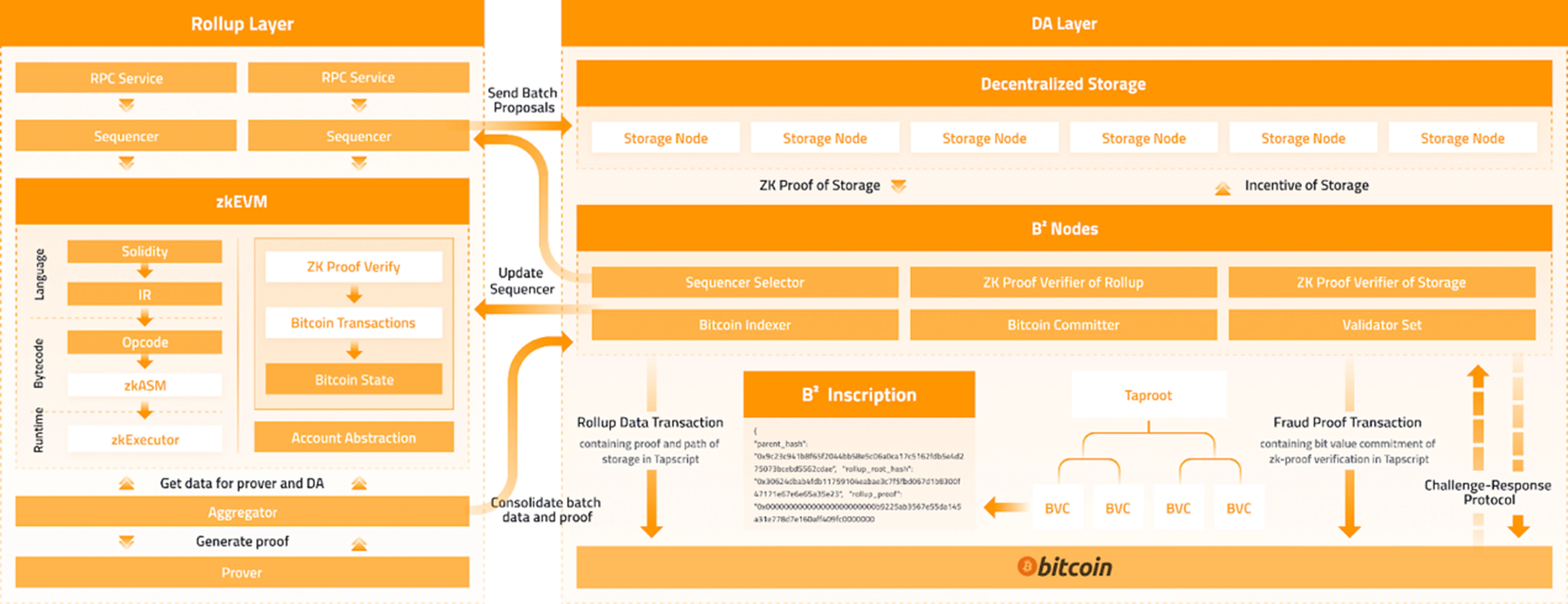 数据可用性层包括分散式存储、B²节点和比特币网络。这一层负责永久存储 Rollup 数据的副本、验证 Rollup zk 证明,并最终在比特币上进行确认。