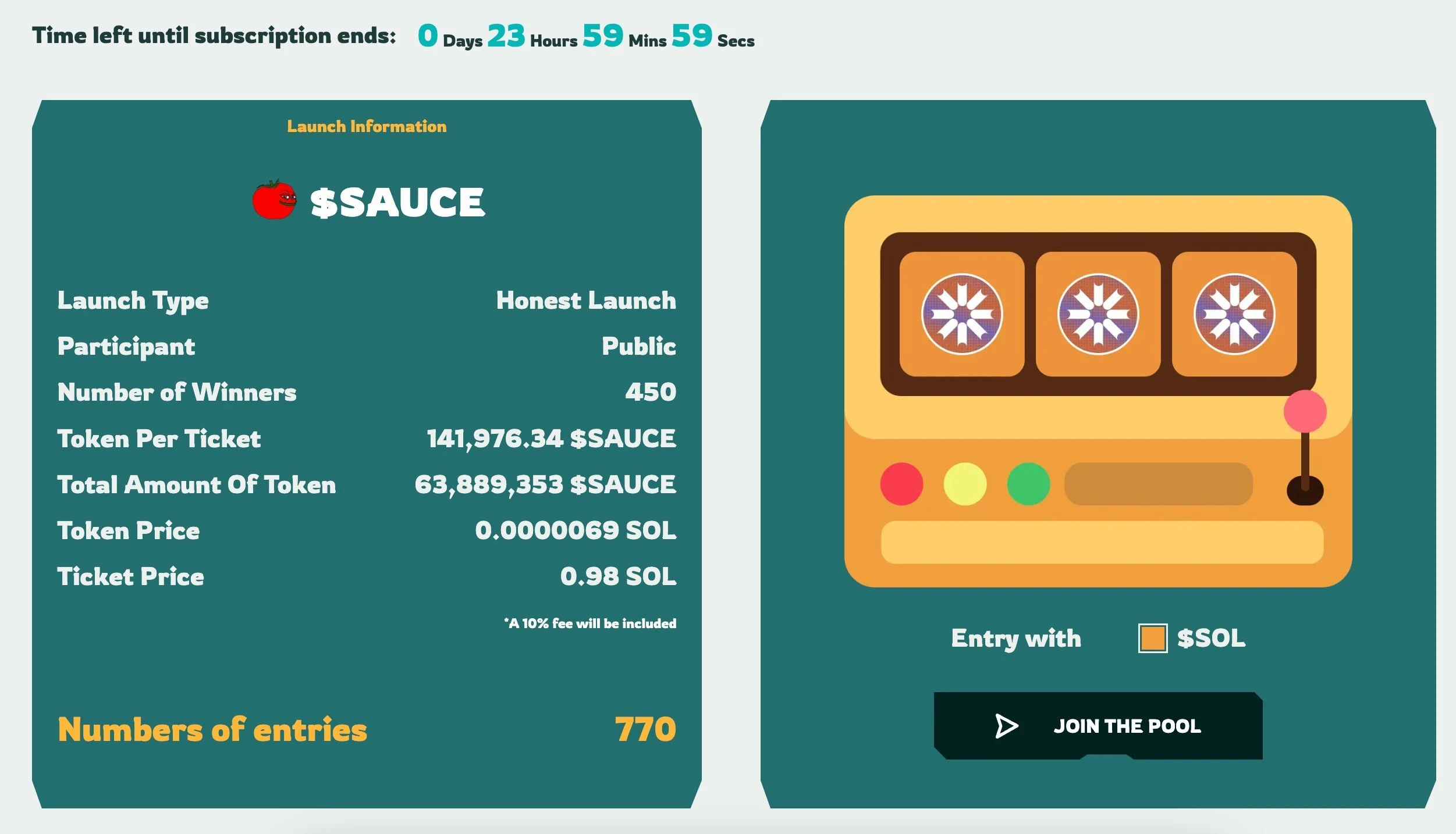 待 Honest Pool 倒计时结束,系统将会自动通过 VRF 数据库进行抽奖,保证抽奖公平公正,届时用户可通过 Launch 页面查看是否可以 Claim。如果已中奖,将扣除 1.078 SOL,获得相应的 SAUCE;反之没有中奖,将退还 0.98 SOL。