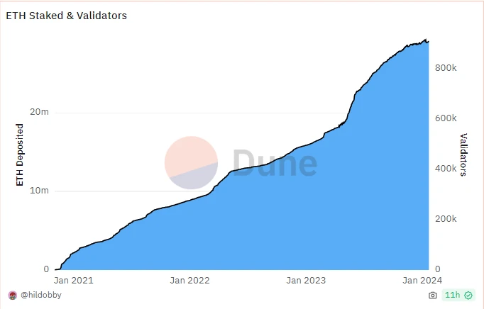 另一方面,大量新的 ETH 被质押,其中很大一部分由 Eigenlayer 驱动。