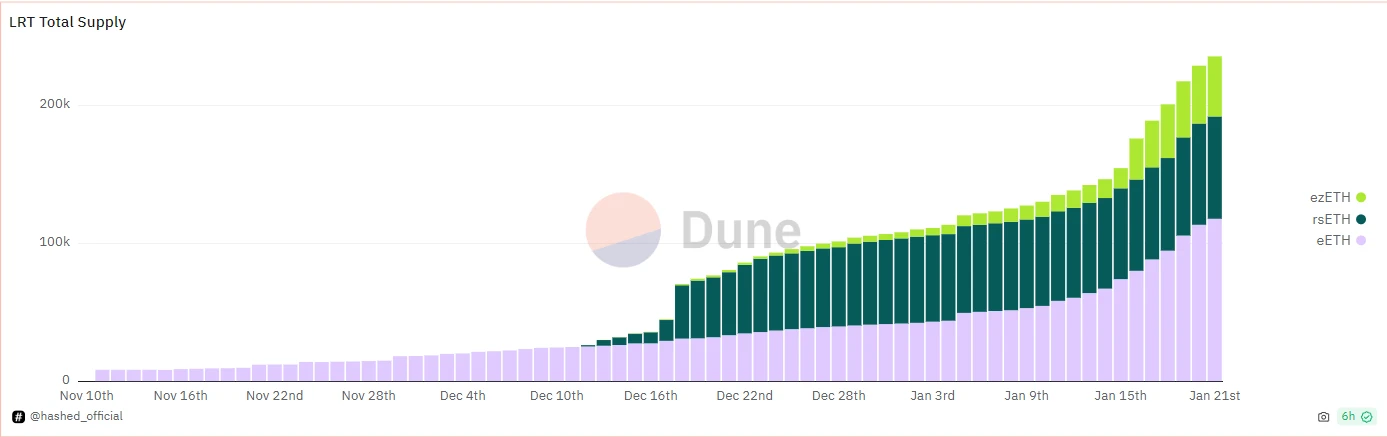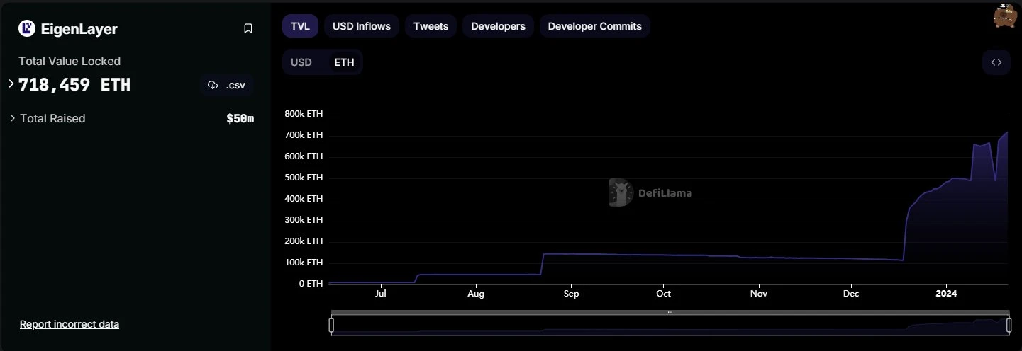 Eigenlayer 持有约 74.5 万枚 ETH。尽管主要 LST 在 EtherFi、Kelp 和 Renzo 等协议的驱动下已达到上限,但这一数字一直在稳定增长。