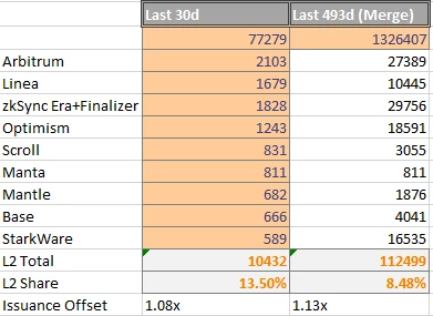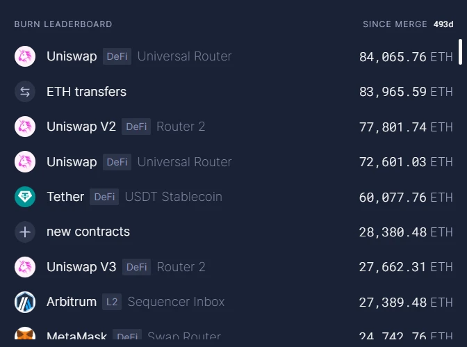 ETH 在过去 30 天以及过去 493 天(自合并以来)一直处于通缩状态,Gas 消耗主要由 Uniswap、ETH 转账、Tether/USDC、L2s、MetaMask 和 OpenSea/Blur 驱动。