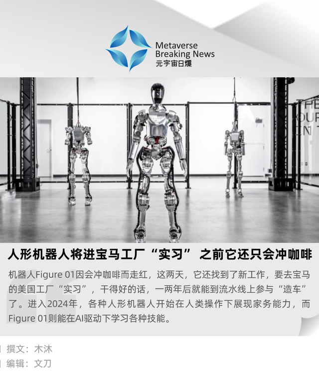 前段时间,名为“Figure 01”的机器人因会冲咖啡而走红。这两天,它还找到了新工作,要去宝马的美国工厂“实习”,干得好的话,一两年后就能到流水线上参与“造车”了。